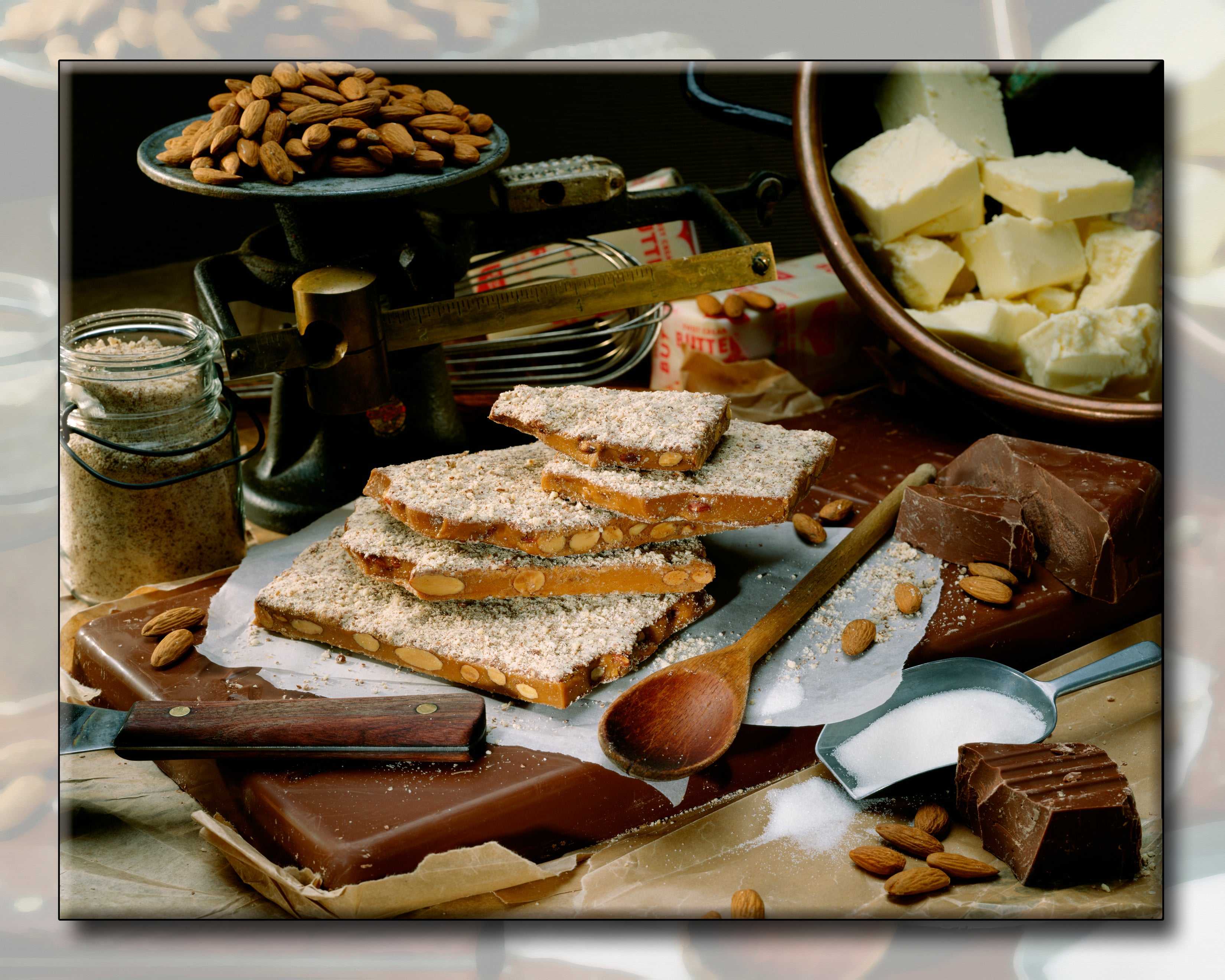 We select only the finest and freshest of all natural ingredients--dairy fresh AA grade sweet cream butter, two varieties of wholesome California almonds, sweet western sugar, and smooth, rich milk chocolate. Then we hand-blend these in small batches in copper kettles over an old-fashioned candy stove to insure you the finest, freshest, most mouth-watering toffee available. And, yes, our almond toffee is gluten-free.