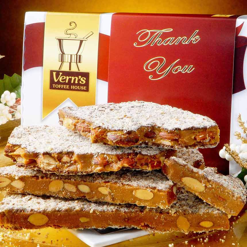 All carriers have eliminated guaranteed delivery times and Vern's Toffee will not assume responsibility for gifts that are delivered after December 25, 2025. We appreciate your business and wish you a safe and healthy holiday season!