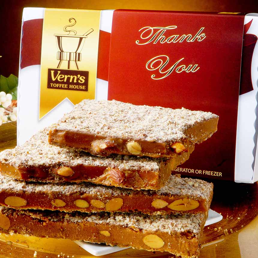 Enhance your toffee gift with a tasteful "Thank You" gift wrap band with a hand-signed greeting card with your personal message attached. Vern's original recipe almond toffee, still hand crafted in small batches in old fashioned copper kettles, has earned world wide acclaim among toffee connoisseurs. From the first easy crunch followed by the burst of sweet buttery goodness blended with roasted almonds and pure milk chocolate, Vern's toffee is unmatched for "melt-in-your-mouth" indulgence. Gluten-free.